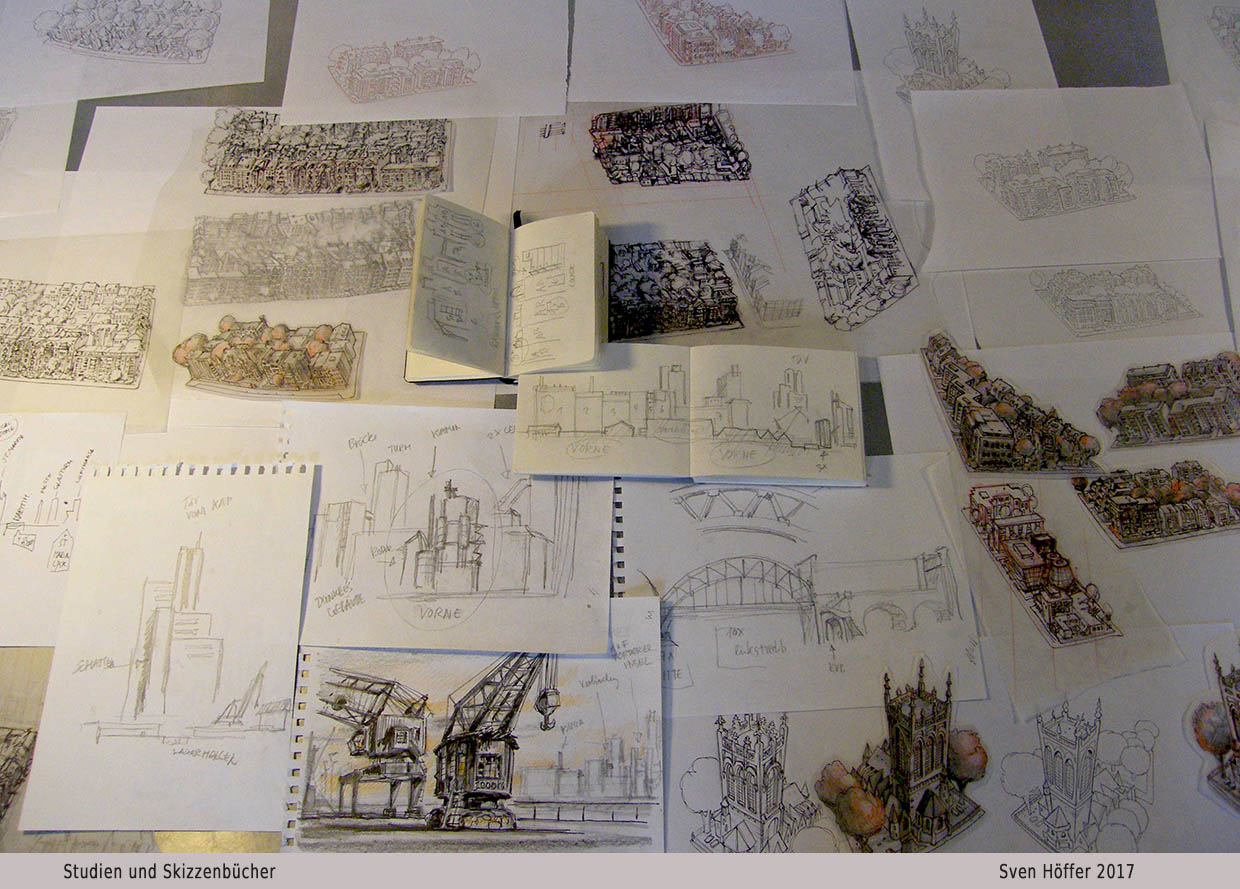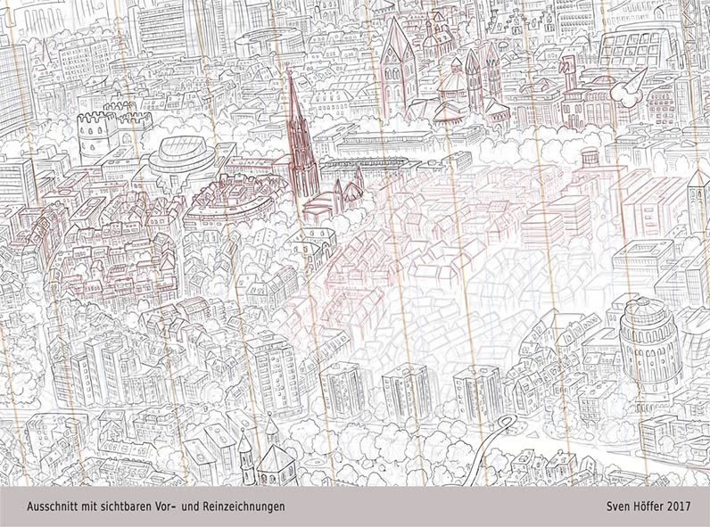 Die klassischen Stadtansichten sind in ihrer perspektivischen Darstellung ja auch ziemlich bieder, und das kam für mich nicht in Frage; da wollte ich schon was Lebendigeres. Das ist ja auch der spaßige Teil beim Zeichnen.